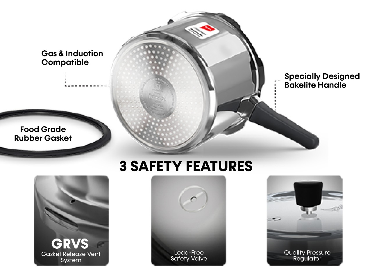 Impex cares a lot about your safety, and it is no different with Delight 5 which offers 3 precautionary features to avoid any potential disasters — Gasket Release Vent System, load-free safety valve and quality pressure regulator.