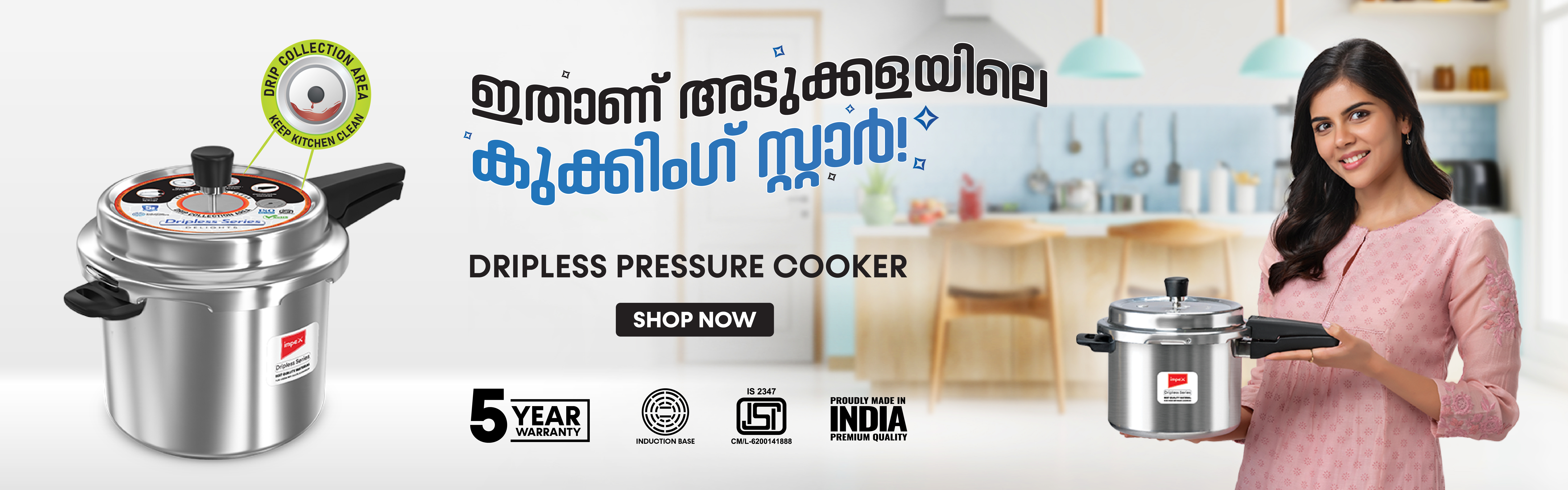 The dripless pressure cooker is Impex's perfect answer to the problems of every Indian home cook who constantly has to put up with normal leaky pressure cookers. The innovative product comes up with a unique cooktop design to make it spillage-free. The curved-up cooktop keeps overflowing froth on the top itself, thus preventing messy hot water from spilling onto the stove or surrounding area. The product is made to reduce the time one usually spends in the kitchen, meaning there is one less thing to worry about when it comes to tidying up.